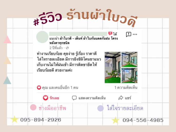 แนะนำผลงานของทางร้านผ้าใบวดี เพื่อตอบคำถามว่ารูปแบบผ้าใบแบบนี้เรียกว่าอะไรพร้อมกับข้อมูลคร่าวๆ (ตัวอย่างนี้เป็น Ver. 1 ซึ่งอาจมีข้อมูลที่ปัจจุบันนี้เปลี่ยนแปลงแล้วค่ะ)