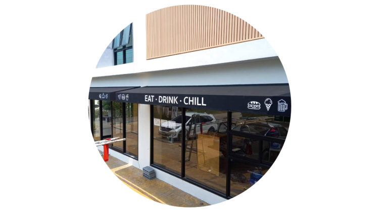 ตัวอย่างงานสกรีนของทางร้านผ้าใบวดี การสกรีนบนผืนผ้าใบช่วยสร้างความโดดเด่นและความสวยงามได้ อีกทั้งยังกันแดดกันฝนอีกด้วย เหมาะสำหรับตกแต่งหน้าร้านอาหาร ร้านกาแฟ และอื่นๆ